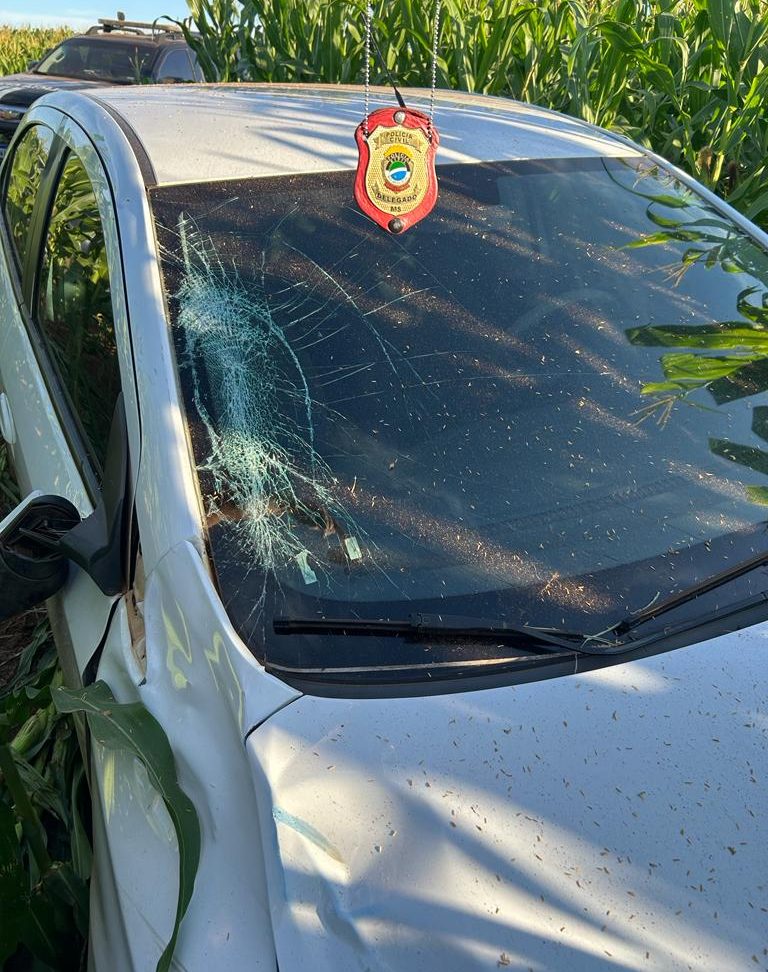 Durante as diligências, os policiais civis encontraram nesta segunda-feira, 05/06, o veículo abandonado em uma plantação de milho no distrito de Cristalina, sendo perfeitamente compatível com os fragmentos veiculares apreendidos no local dos fatos.