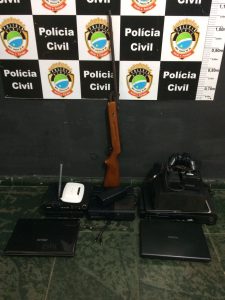 No quarto, também localizaram 12 porções de cocaína já embaladas e prontas para venda que pesaram aproximadamente 9 gramas e uma porção pesando aproximadamente 2,5 gramas, vários aparelhos de telefone celular, um simulacro de arma de fogo (pistola), uma espingarda de pressão, produtos eletrônicos (vídeo games e produtos de informática), todos sem origem comprovada e que serão alvo de investigação policial.