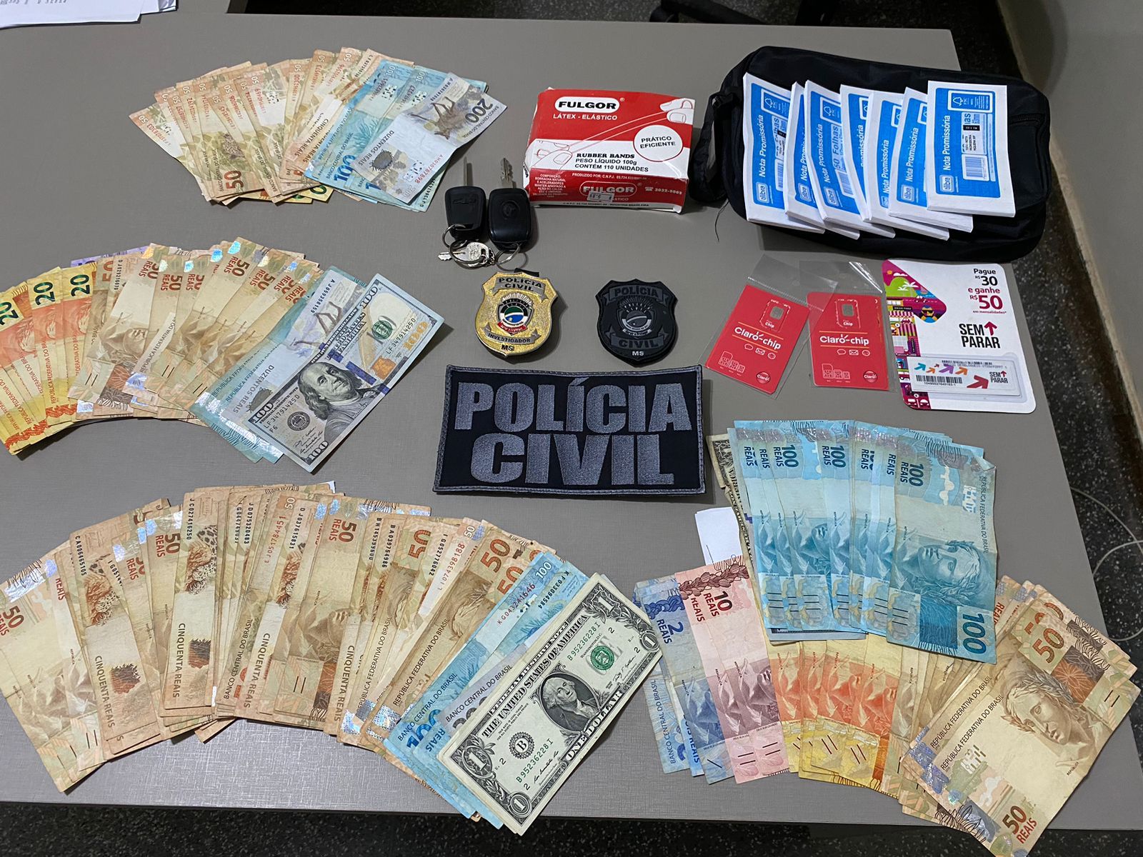 Ontem, 08/02, os indivíduos foram localizados e identificados na BR-163. Durante a abordagem foi localizada grande quantia de dinheiro em espécie, assim como vários objetos utilizados nas práticas delituosas, como por exemplo talões de nota promissória.