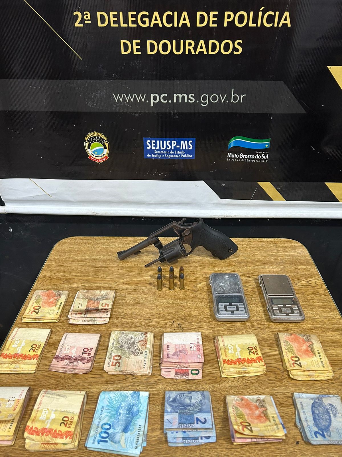 Após o cumprimento de um mandado de busca e apreensão em sua residência, localizada no bairro Canaã IV, policiais civis localizaram a arma de fogo do tipo revólver calibre 38 municiada com 6 munições escondida em uma pilha de tijolos em frente à casa. Juntamente com a arma, foram localizados cerca de R$ 2,5 mil, duas balanças de precisão e uma máquina de cartão de crédito.