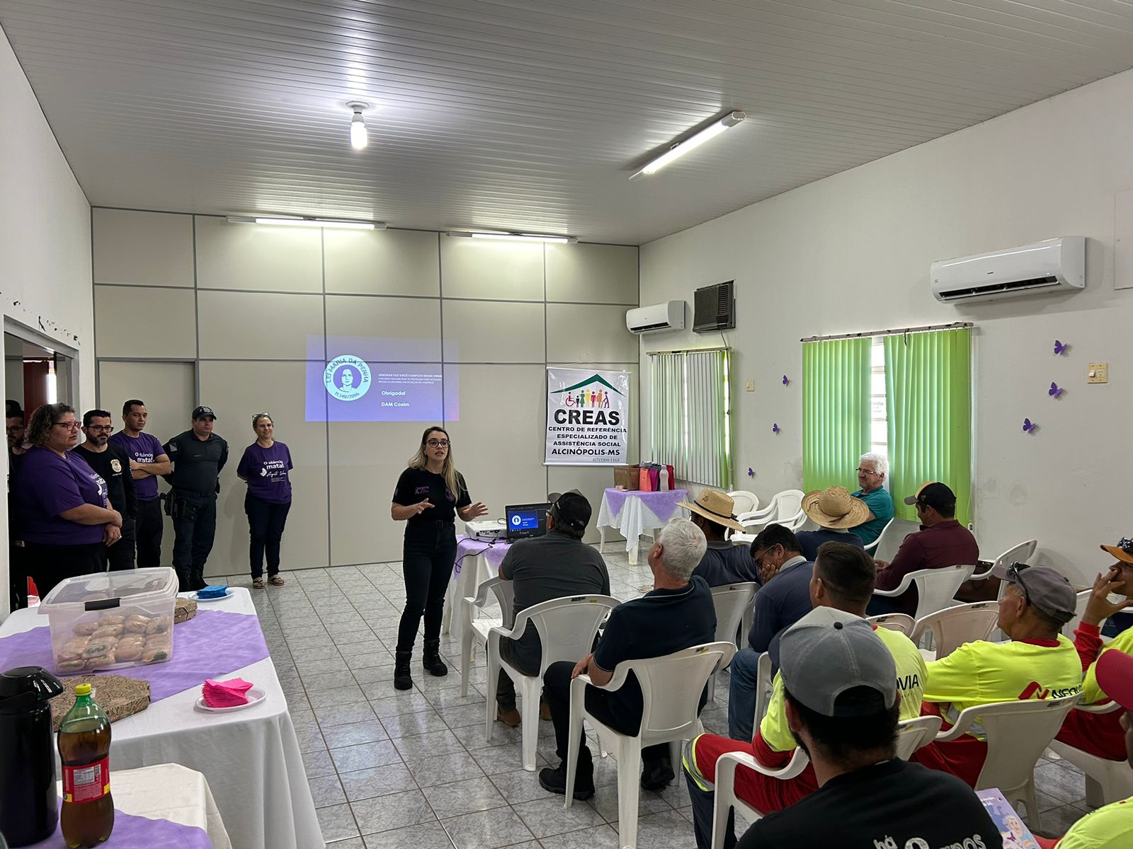 Na última quinta-feira (15), a Polícia Civil, por intermédio da Delegacia de Atendimento à Mulher (DAM) de Coxim esteve no CRAS de Alcinópolis fazendo palestra sobre o Agosto Lilás, combate e prevenção da violência doméstica. Na parte da manhã o público foi de homens, trabalhadores de obras do Município. Já na parte da tarde, o público foi de mulheres assistidas pelo CRAS.