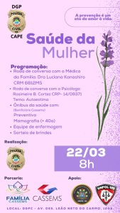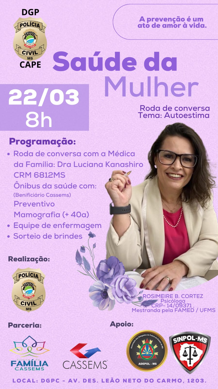 A primeira ação será no dia 22 de março (quarta-feira), às 8 horas, no estacionamento da Delegacia Geral da Polícia Civil (DGPC). Com a parceria da Caixa de Assistência dos Servidores do Estado de Mato Grosso do Sul (CASSEMS), as mulheres terão acesso ao ônibus da saúde, que vai oferecer exames de mamografia para as beneficiárias com 40 anos ou mais, além de preventivo, aferição de pressão e glicemia e uma roda de conversa com a médica da família Luciana Kanashiro e com a psicóloga Rosimeire Cortez, que vai falar sobre autoestima.