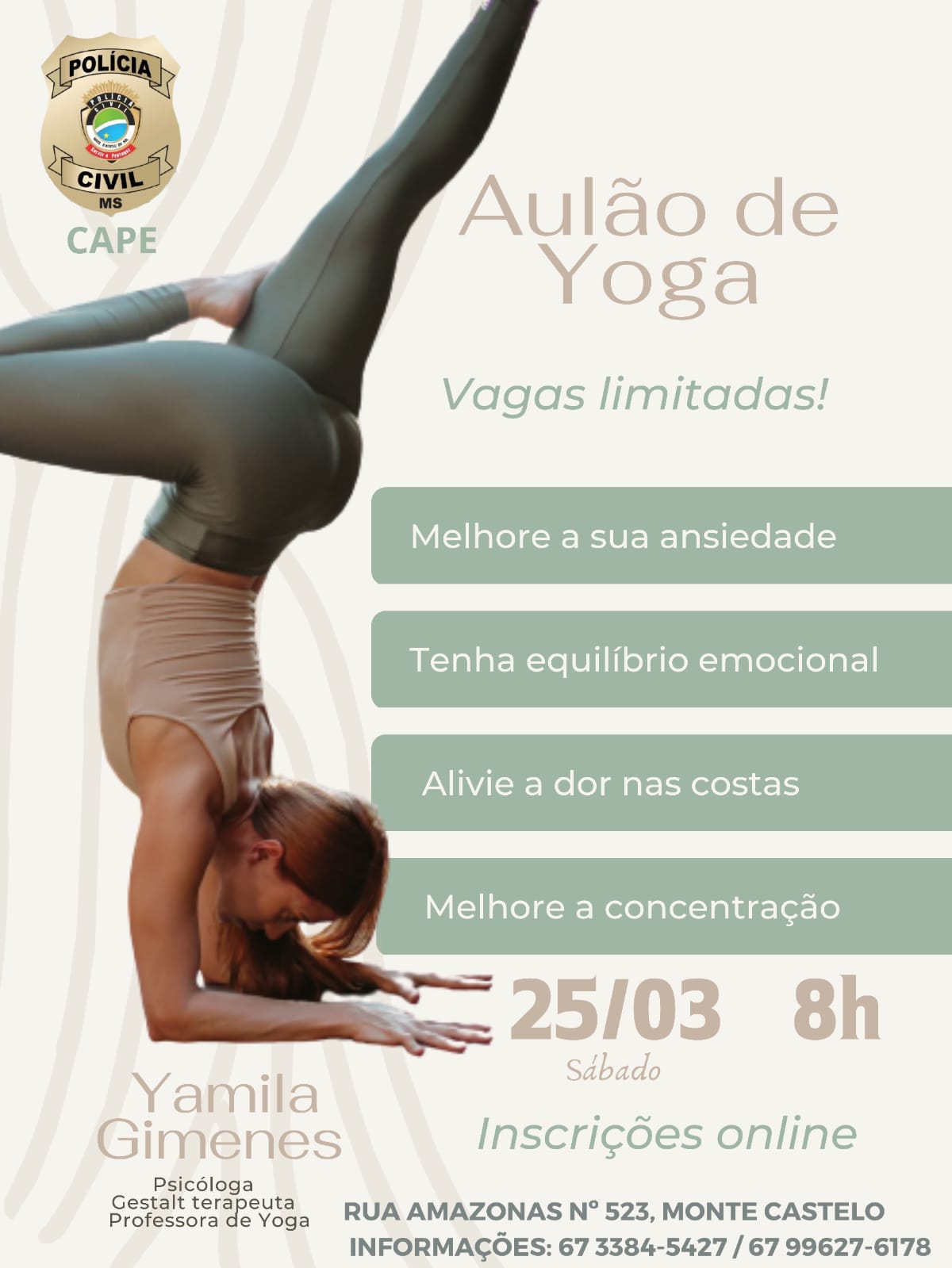 Já o segundo encontro, voltado para homens e mulheres, acontece no dia 25/03 (sábado), às 8 horas, na sede da CAPE, na Rua Amazonas, 523, Monte Castelo. Será um “Aulão de Yoga”, com a professora e psicóloga Yamila Gimenes, que irá trabalhar com foco na melhoria da ansiedade, equilíbrio emocional, alívio das dores nas costas e melhoria da concentração.