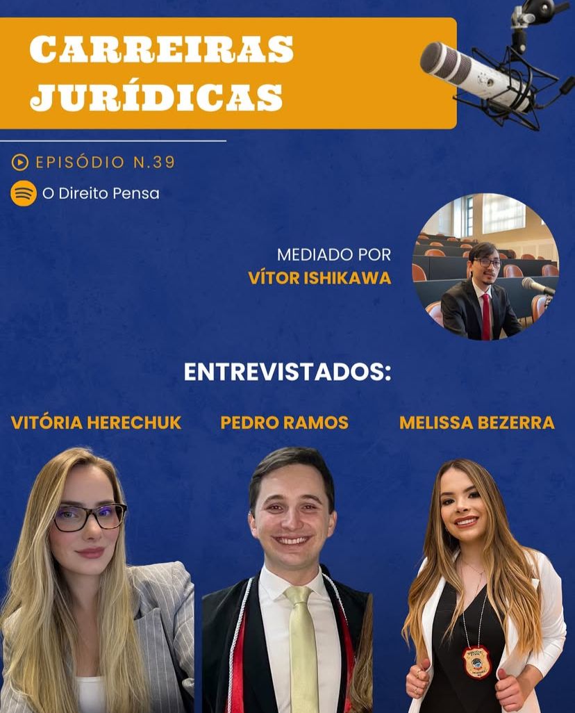 O episódio, de número 39, teve como tema “Carreiras Jurídicas” e contou com a mediação de Vítor Ishikawa, doutorando em Direito Penal pela Faculdade de Direito da USP. O diálogo reuniu ainda a Promotora de Justiça do Estado de Mato Grosso do Sul Vitória Herechuk e o Juiz de Direito do Estado do Paraná Pedro Ernesto Ramos, ambos egressos, assim como a Delegada de Polícia, do curso de Direito da Universidade Estadual de Maringá (UEM).
