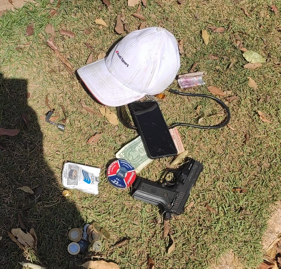 Após o reforço chegar no local, o indivíduo foi abordado e preso. Durante a abordagem, foi encontrada uma arma de fogo, calibre 380, municiada com 14 cartuchos no carregador. O homem admitiu ter furtado a arma de uma das residências antes de tentar escapar com ela na cintura.