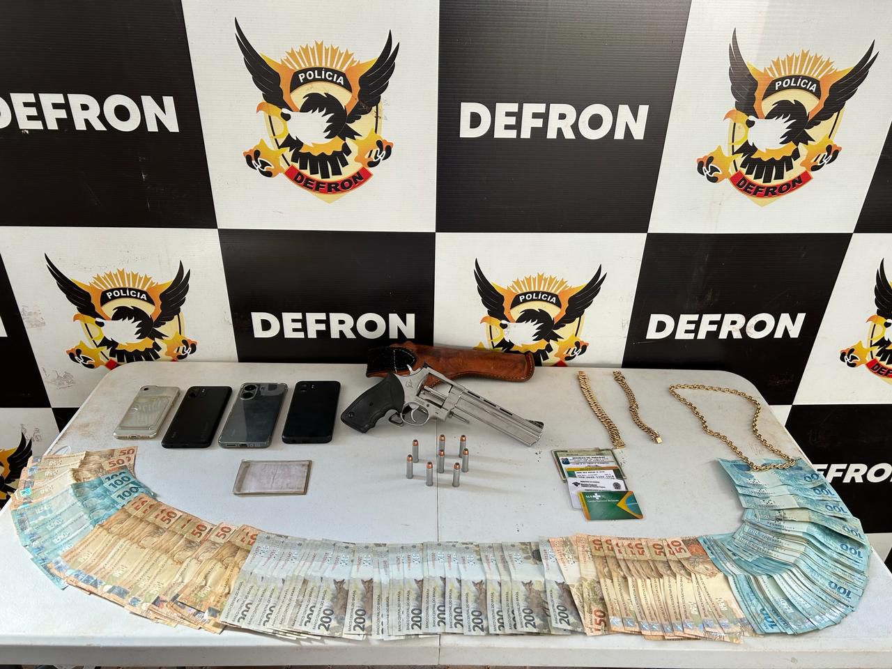 No local, os policiais também encontraram um revólver calibre .357, com 08 munições, diversos documentos falsos dos dois indivíduos, mais de R$ 13 mil, sem origem declarada, e dois veículos automotores, um FIAT Mobi e um FIAT Strada, com suspeita de adulteração. Em checagens nos sistemas policiais, constatou-se que o FIAT Mobi possui registro de furto no Estado de São Paulo.