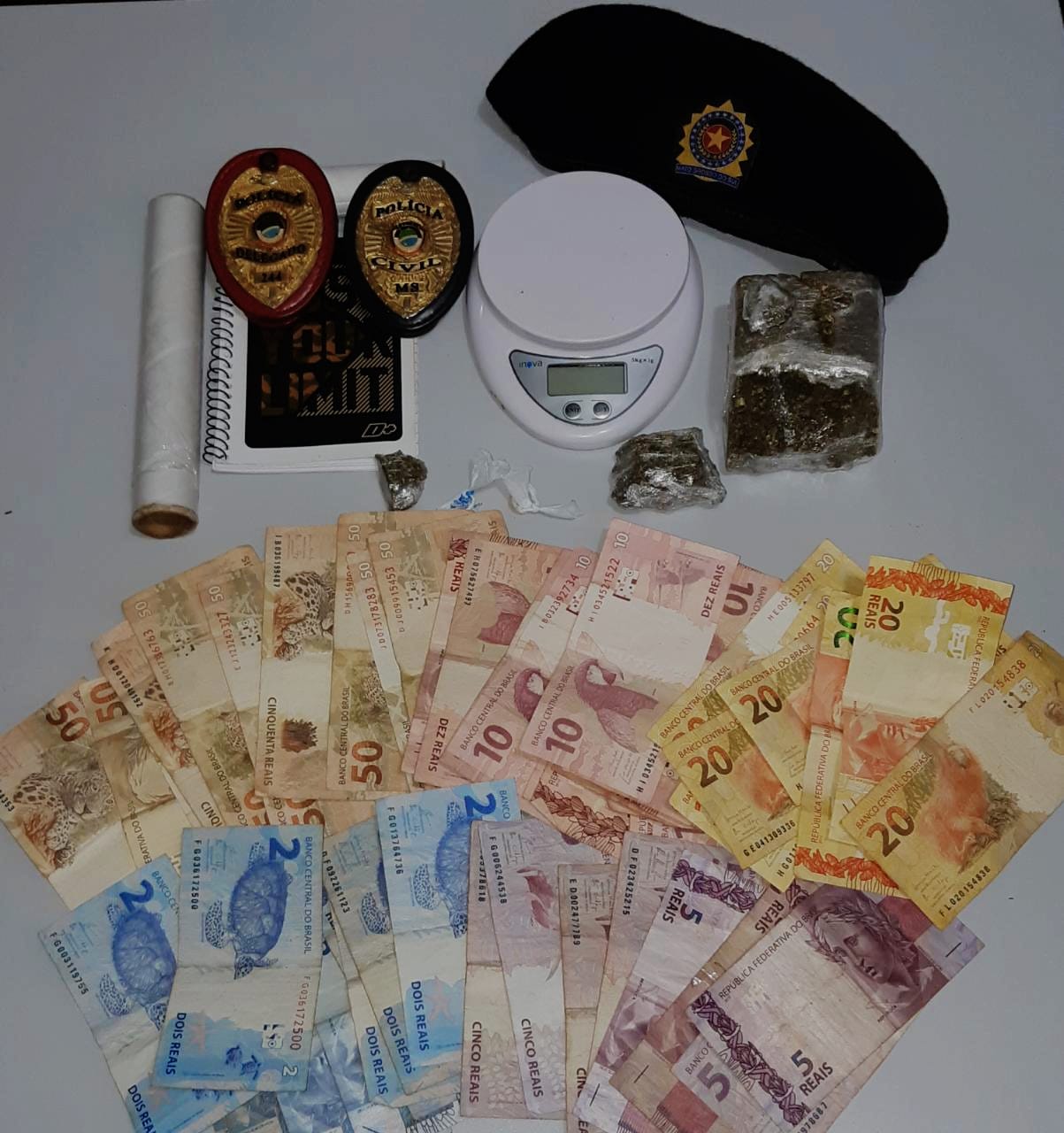 Diante das suspeitas, os policiais realizaram busca pessoal na casa e encontraram um tablete de maconha enterrado nos fundos da casa, várias cédulas de dinheiro trocado, uma balança de precisão, plásticos para o embalo da droga e um caderno de anotações com toda a contabilidade do tráfico.
