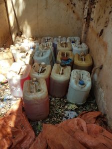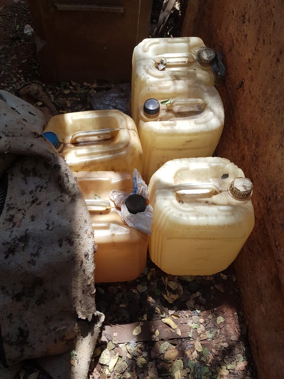 Os galões estavam ocultos sob uma lona e espuma de colchão, rente ao muro, nos fundos do estabelecimento.