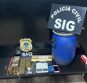 Nova Andradina (MS): A Polícia Civil, através da SIG (Seção de Investigações Gerais) de Nova Andradina prendeu, em flagrante delito, suspeito de tráfico de drogas que escondia o entorpecente em uma mata em Nova Andradina. Os investigadores receberam denúncia anônima, nesta quarta-feira (9), dando informações de que um homem estaria escondendo drogas em um barril na mata localizada nas proximidades da Rua Maria Borges Lacerda.