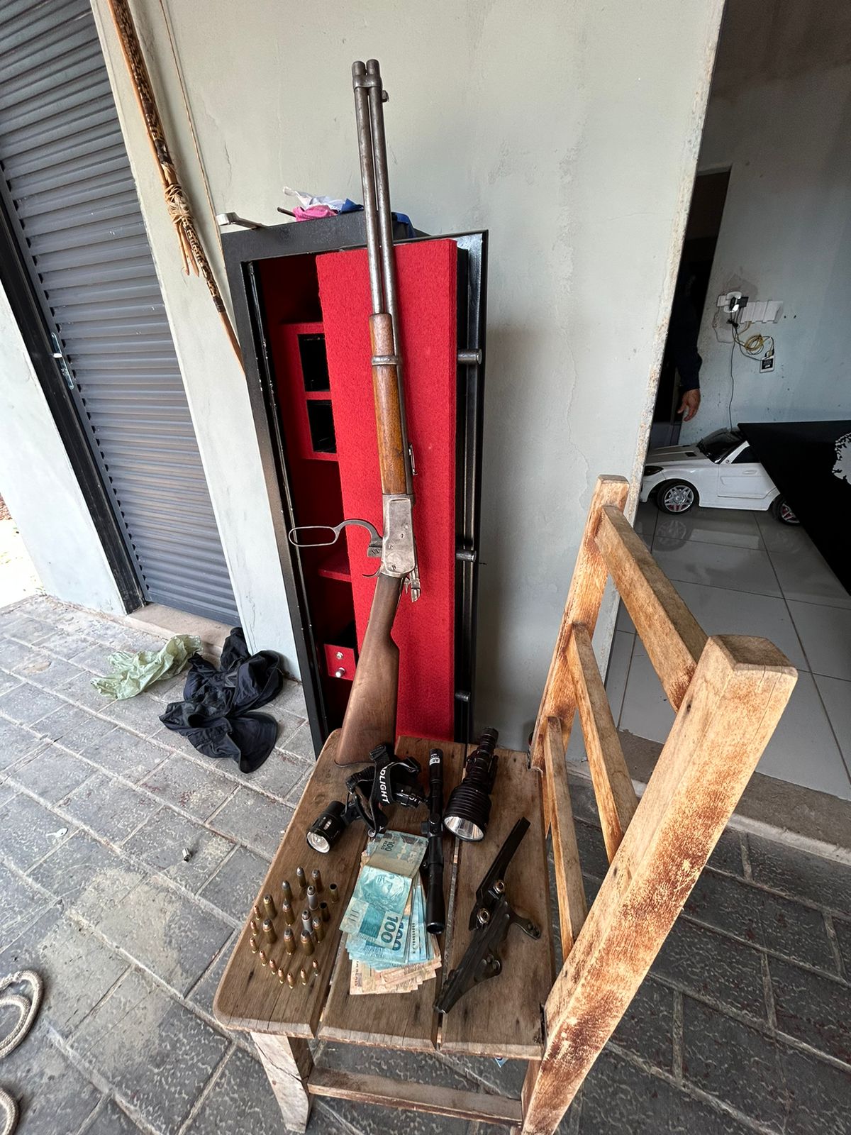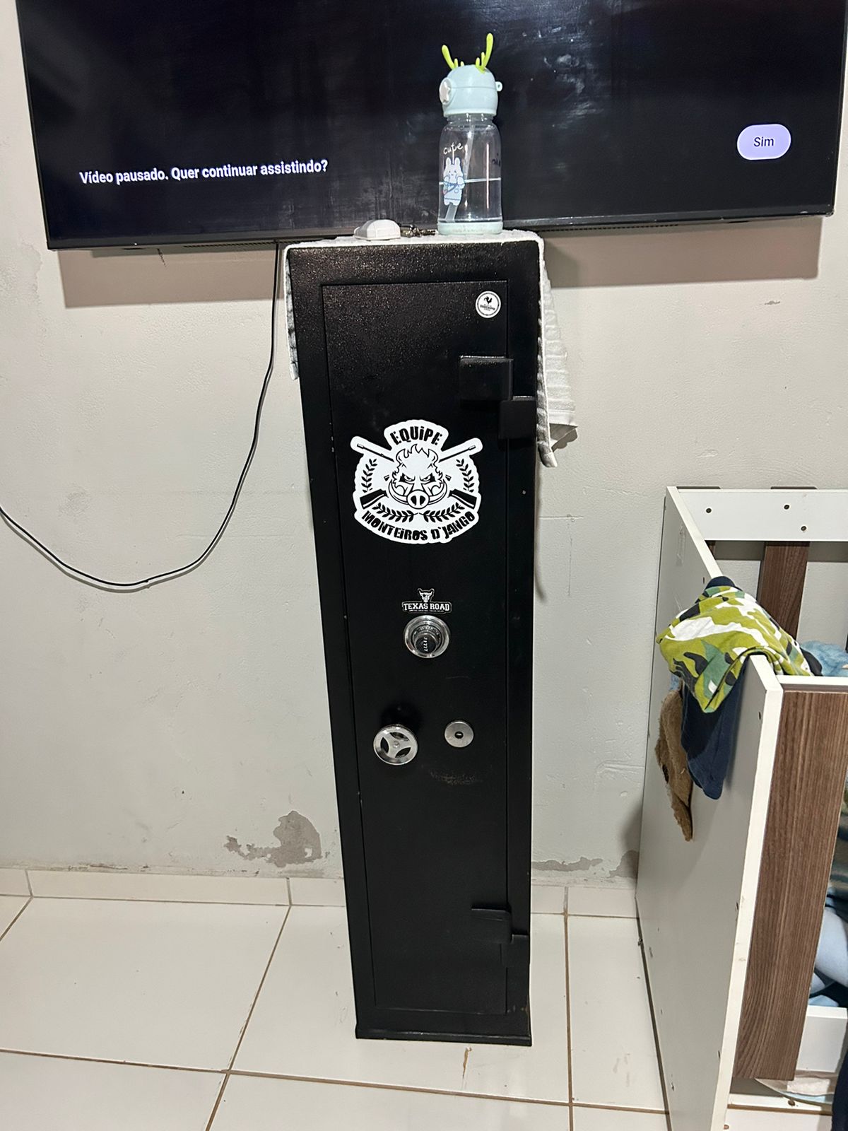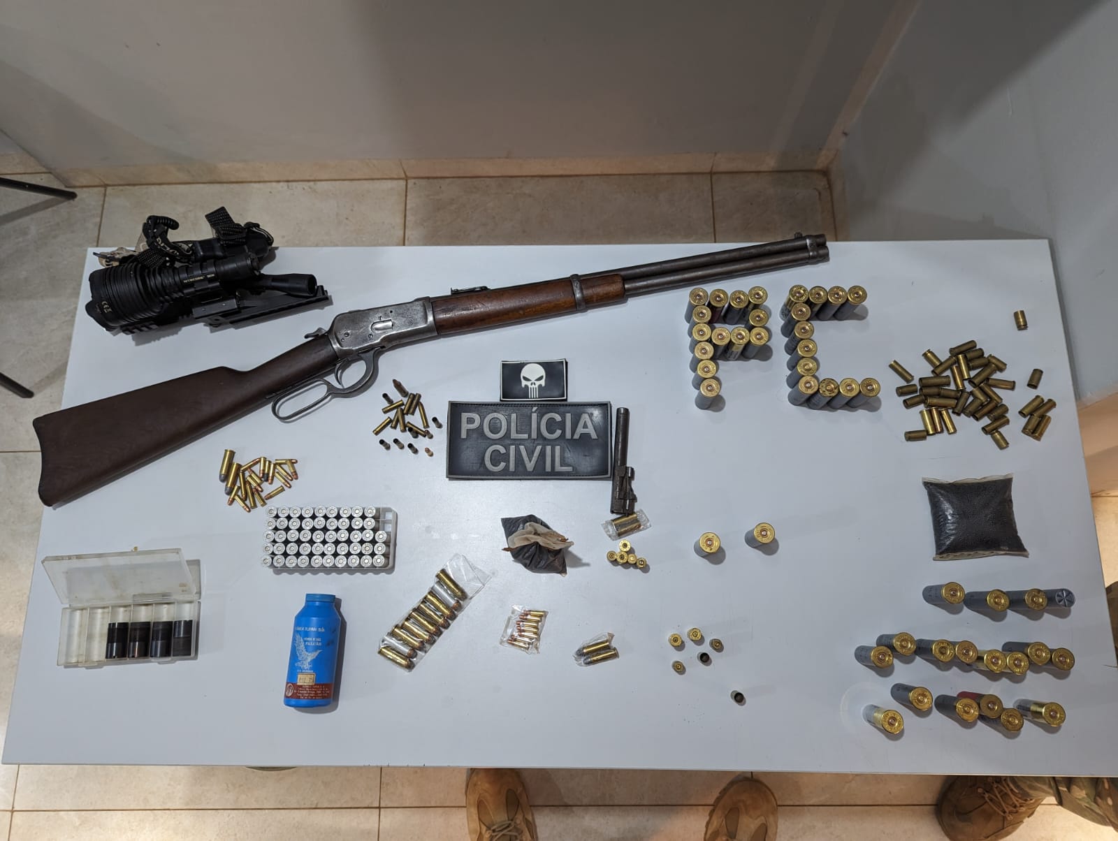 Durante a busca, no local de trabalho do suspeito, foram encontradas diversas munições de calibres permitidos e restritos, além de um recipiente contendo pólvora e dois sacos de chumbo. Na residência, as equipes localizaram uma carabina calibre .44 Magnum, marca Winchester, diversas munições e estojos de calibres variados, bem como acessórios relacionados a armas de fogo, incluindo lanternas, trilho de mira, escopo compacto e luneta.