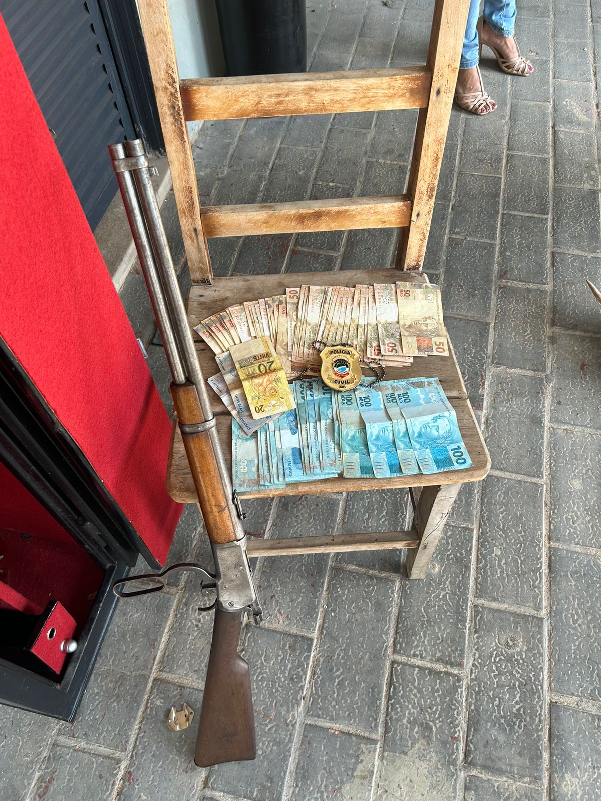 Além disso, foi encontrado um valor de R$ 4.274,00 em espécie. Durante a entrada da polícia na residência do suspeito, este conseguiu escapar pelos fundos da casa, carregando possivelmente uma espingarda calibre 12, e fugiu para um matagal próximo.