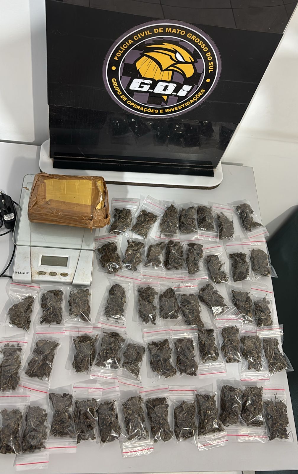 Os investigadores foram ao local após denúncia anônima sobre um possível desmanche de veículo. No imóvel, encontraram 48 porções de maconha embaladas para venda, uma barra prensada da droga, uma balança de precisão e um celular. O suspeito confessou que comercializava os entorpecentes por R$ 10 cada.