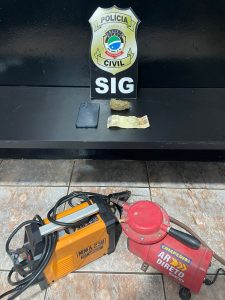Com ele também foi apreendido um compressor furtado e a quantia de R$ 1,8 mil, em notas falsas de R$ 200,00 e R$ 50,00, que estavam escondidas em um travesseiro. Segundo apurado, a Polícia Civil recebeu uma informação de que o autor estava recebendo objetos furtados, como forma de pagamento de droga e que também estaria utilizando dinheiro falso no comércio local.
