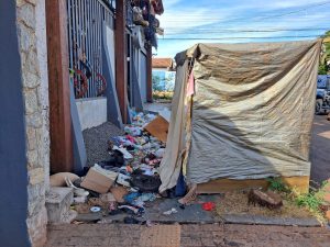 após nova denúncia, prende senhor 54 anos que, de forma reiterada já tinha sido advertido e orientado acerca do crime de poluição. O homem teria construído uma espécie de “barraco” na calçada para que moradores de rua e usuários de entorpecentes usassem de abrigo e banheiro, bem como teria lixos acumulados em torno de sua residência.
