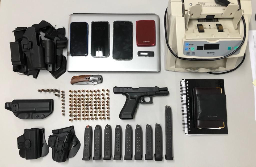 Na posse do investigado, os policiais apreenderam  uma pistola Glock 9mm, 90 munições calibre 9 mm, 8 munições calibre .32, 01 munição calibre .45, 01 munição calibre .38, 01 munição calibre 454 (uso restrito), 01 munição calibre 762/39 (uso restrito) e 9 carregadores, sendo um deles estendido, com capacidade para 30 munições, além de 8 carregadores com capacidade para 17 munições.