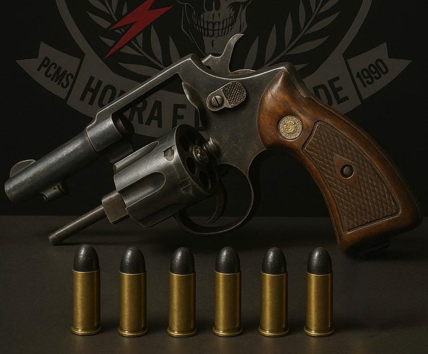 Neste momento, os policias reconheceram o passageiro como sendo pessoa que estava com mandado de prisão em aberto, motivo pelo qual abordaram o veículo. No momento da revista pessoal, foi localizado um revólver, calibre 38, municiado com 6 munições.