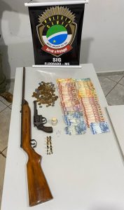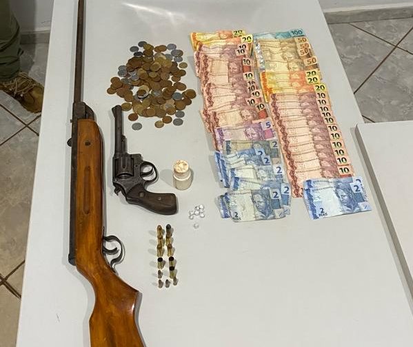 Além disso, foram apreendidas duas armas de fogo, sendo um revólver, calibre.38, e uma espingarda adaptada para o calibre .22. Os policiais encontraram também aproximadamente R$ 800,00, em espécie, divididas em notas de R$ 10,00 e R$ 20,00 e moedas.