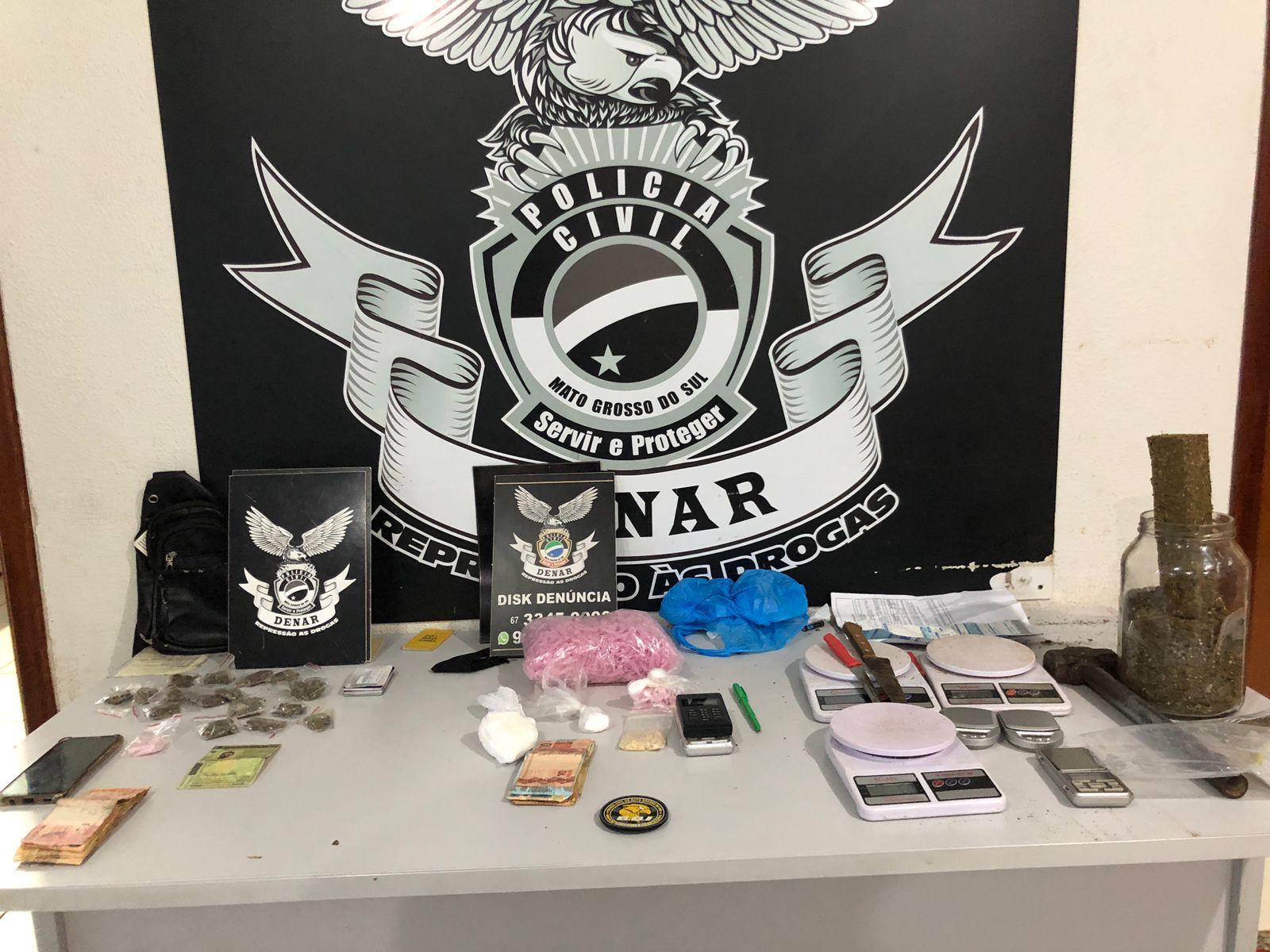 Policiais civis da DENAR (Delegacia Especializada de Repressão ao Narcotráfico), em ação conjunta com o GOI (Grupo de Operações e Investigações), deram cumprimento aos mandados de busca e prisão expedidos pela 5ª vara criminal da comarca da capital. O mandado de prisão preventiva foi expedido em desfavor de C.N.S.O. (37 anos), responsável pela venda de drogas do tipo maconha, pasta base de cocaína e cocaína, no bairro Jardim Monumento.