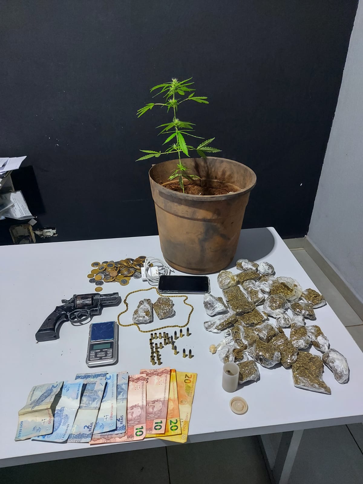 Foram localizadas 28 porções de drogas do tipo maconha, totalizando 550 gramas, uma arma de fogo do tipo revólver, calibre .22, 8 (oito) munições intactas e 18 (dezoito) capsulas de munições de mesmo calibre, uma planta de maconha, e uma porção de CRACK.