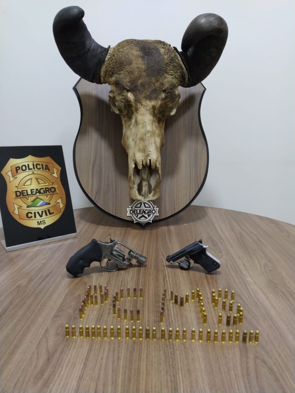 Na noite do dia 27 de julho de 2023, Policiais Civis da DELEAGRO – Delegacia Especializada de Combate a Crimes Rurais e Abigeato realizavam operação policial na zona rural no entorno do município de Campo Grande visando coibir a prática de crimes no meio rural quando, por volta das 19h30min, procederam a abordagem de uma caminhonete, conduzida pelo autor, e durante entrevista notaram extremo nervosismo do mesmo quando questionado sobre a posse de objetos ilícitos no interior do automóvel, motivando a busca veicular. Busca minuciosa foi realizada no veículo, tendo sido localizado um fundo falso no console central da caminhonete e em seu interior duas armas de fogo, sendo elas: um revólver calibre .22 com 06 munições intactas e uma pistola .635 desmuniciada, além de uma sacola plástica contendo 35 munições de calibre .22 e 52 munições de calibre .635, todas intactas. Sendo assim, o suspeito foi conduzido a DELEAGRO, sem lesões corporais para as providências de praxe.