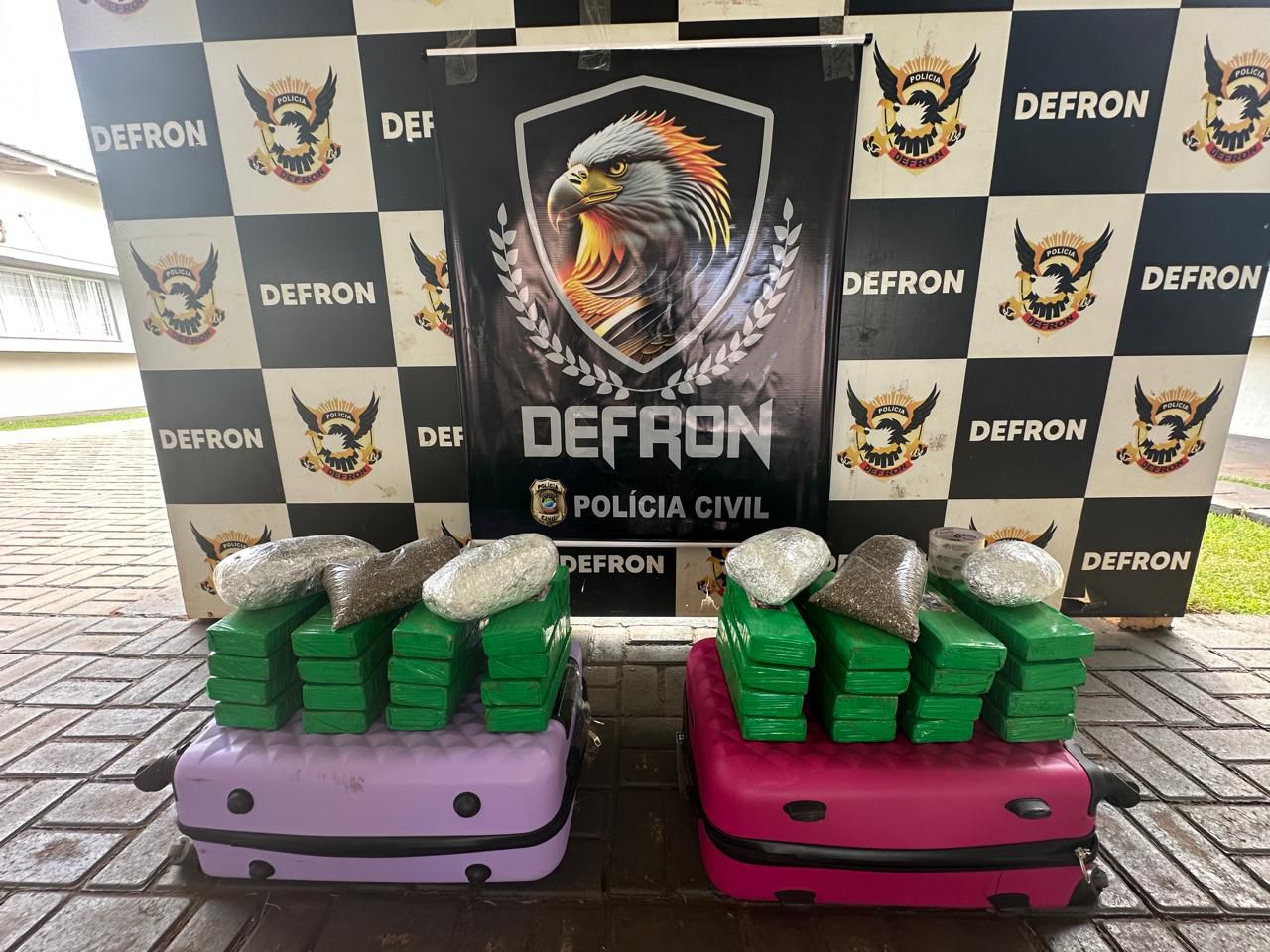A Polícia Civil, por meio da Delegacia Especializada de Repressão aos Crimes de Fronteira (DEFRON), prendeu em flagrante, na manhã desta terça-feira (27), uma mulher de 33 anos que transportava 32 tabletes de maconha e aproximadamente 5,5 kg de sementes da planta cannabis.