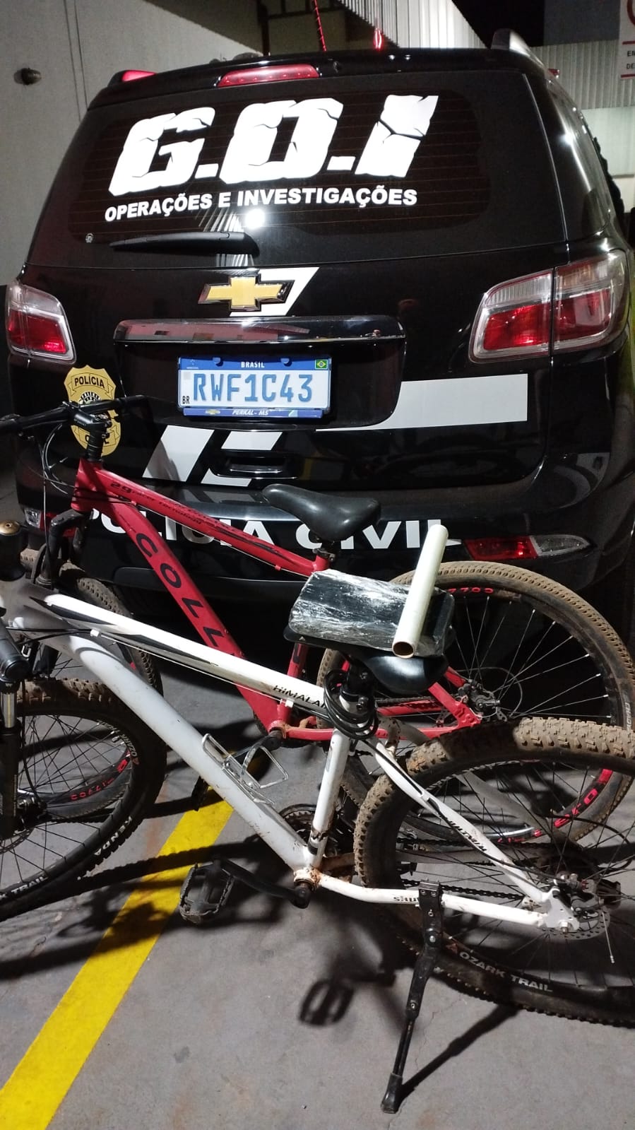Na casa também foram apreendidas duas bicicletas, que a mulher afirmou que não possuía nota fiscal e que era produto de furto, sendo uma de marca Ozark de cor branca e uma Colli de cor vermelha. A autora disse que adquiriu a bicicleta branca por R$ 400,00 e a vermelha por R$ 300,00.