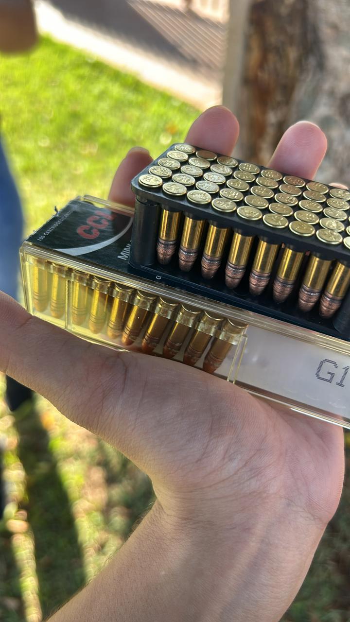 Após o cumprimento da ordem judicial de prisão, a equipe da DAM realizou uma busca na residência, tendo em vista a suspeita de posse de arma de fogo sem registro. Apesar de não localizar arma de fogo, a equipe apreendeu 100 munições de calibre .22 de origem estrangeira, motivo pelo qual autuou G.J.R. pela posse irregular de munições de arma de fogo de uso permitido.