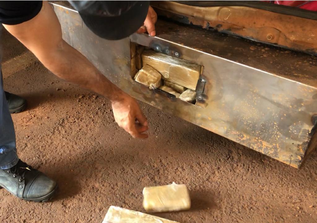 Os policiais realizavam bloqueio na via, quando foi dada ordem de parada para o condutor do veículo, que era conduzido por um homem, e após realizada vistoria no veículo os policiais encontraram compartimentos para ocultar ilícitos localizados no para-choque traseiro e no painel do carro.