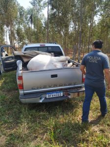 Na sexta-feira (3) uma equipe do Iagro fazia deslocamento na região quando foi ultrapassada por uma camionete S-10, cor prata e que levava na carroceria um animal abatido. A equipe do acompanhou o veículo e, ao ser abordado, o condutor de 24 anos não soube explicar a origem do animal e respondeu que teria comprado na Aldeia Barro Preto, município de Porto Murtinho, e não soube explicar por qual motivo a marca do mesmo havia sido removida.