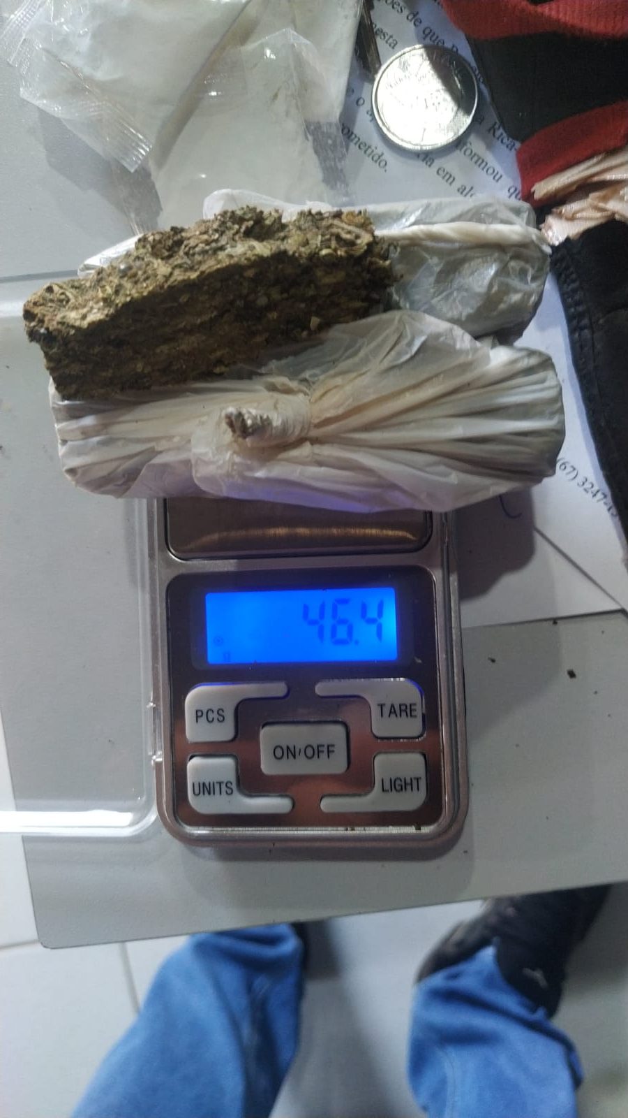 Durante a busca pessoal foram encontrados no bolso do moletom de um deles, 3 porções grandes de maconha, devidamente embaladas, pesando aproximadamente 46,4 gramas.