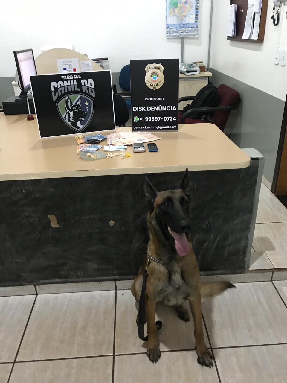Com o outro homem foram encontradas duas pedras de substância análoga a pasta-base de cocaína, totalizando 2,72g. Ao ser questionado, o mesmo relatou que o homem de 24 anos teria encomendado a substância para revender, informando, ainda, onde estava residindo. Em diligências em sua residência, com o apoio do cão K9 Brisa, foi possível localizar escondida no interior de uma máquina de lavar, 12,5g de pasta-base de cocaína, uma balança de precisão e R$ 116,00 em notas de pequeno valor, bem como comprovantes de depósito e envelopes para depósito.