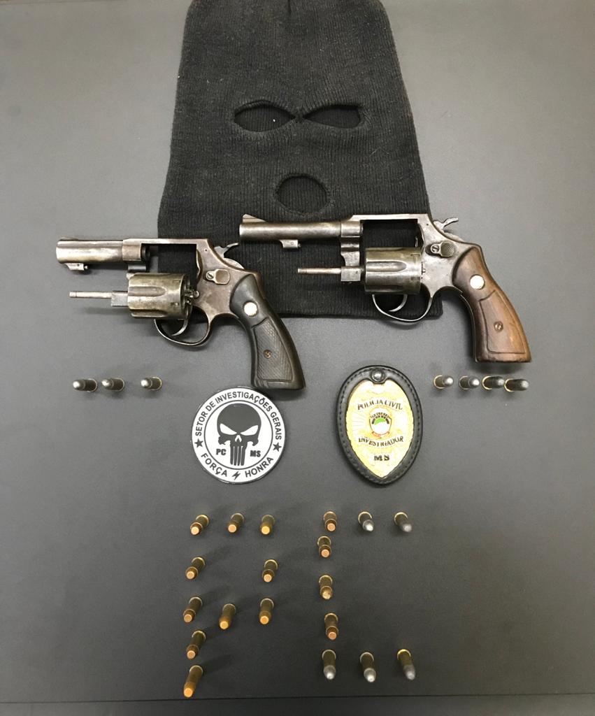 Após investigações preliminares o suspeito foi identificado e, havendo fundadas suspeitas, nesta terça-feira (16), foram realizadas buscas em dois imóveis onde foram encontrados dois revólveres de calibre .38 e diversas munições.