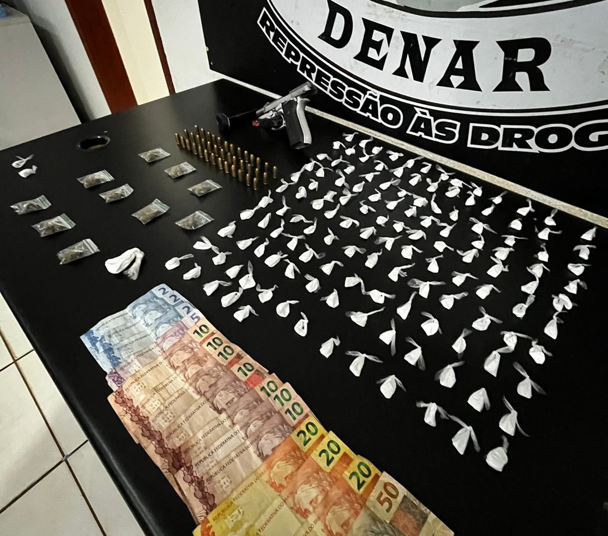 No endereço alvo das investigações foram apreendidas porções de cocaína e maconha, além de notas de dinheiro e uma pistola Taurus, calibre .380. Foram apreendidos também dois carregadores e 39 munições.