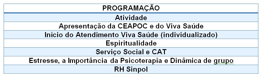 As palestras serão realizadas pelos membros da Equipe CEAPOC, dos setores de Capelania, Serviço Social e Psicologia. Os seguintes temas serão abordados: Espiritualidade; Orientação sobre a Comunicação de Acidente de Trabalho-CAT e Estresse Laboral: abordagem dinâmica e a importância da Psicoterapia.