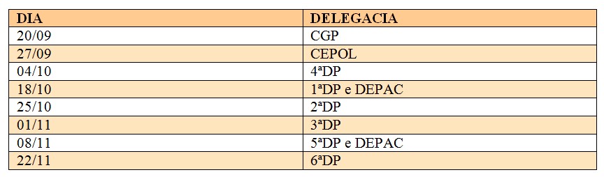 Locais onde as palestra já foram realizadas: Coordenadoria Geral de Perícias-CGP, CEPOL e 4ª Delegacia de Polícia.