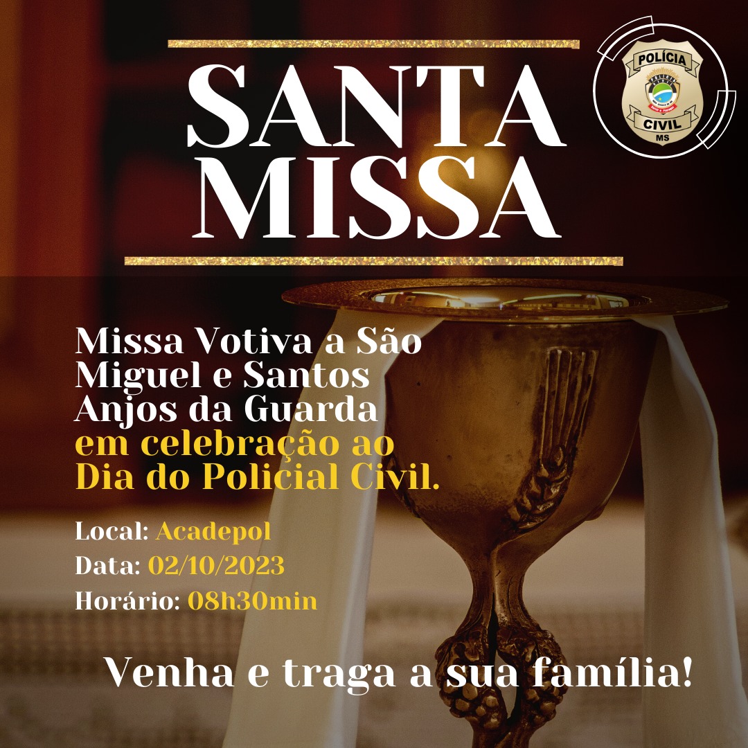 A Delegacia-Geral da Polícia Civil realiza na próxima segunda-feira, 02/10, às 08h30min, uma missa votiva dedicada a São Miguel e aos Santos Anjos da Guarda. A solenidade acontecerá no auditório da Academia de Polícia Civil (Acadepol) em homenagem ao Dia Estadual do Policial Civil.