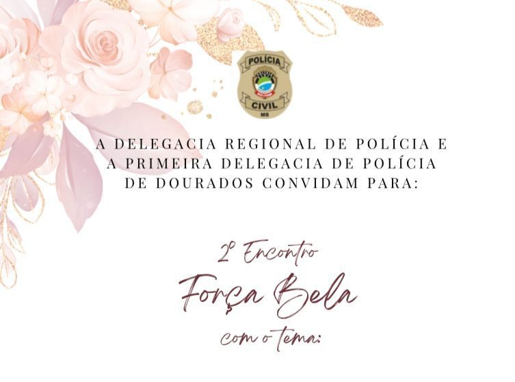 A 1ª Delegacia de Polícia Civil de Dourados-MS, com o apoio da Delegacia Regional e da OAB/MS – 4ª Subseção Dourados, realiza no próximo dia 08/03 (sexta-feira), às 08h30min, o II Encontro Força Bela. O evento será realizado no auditório da OAB, na Rua Onofre Pereira de matos, 1712.