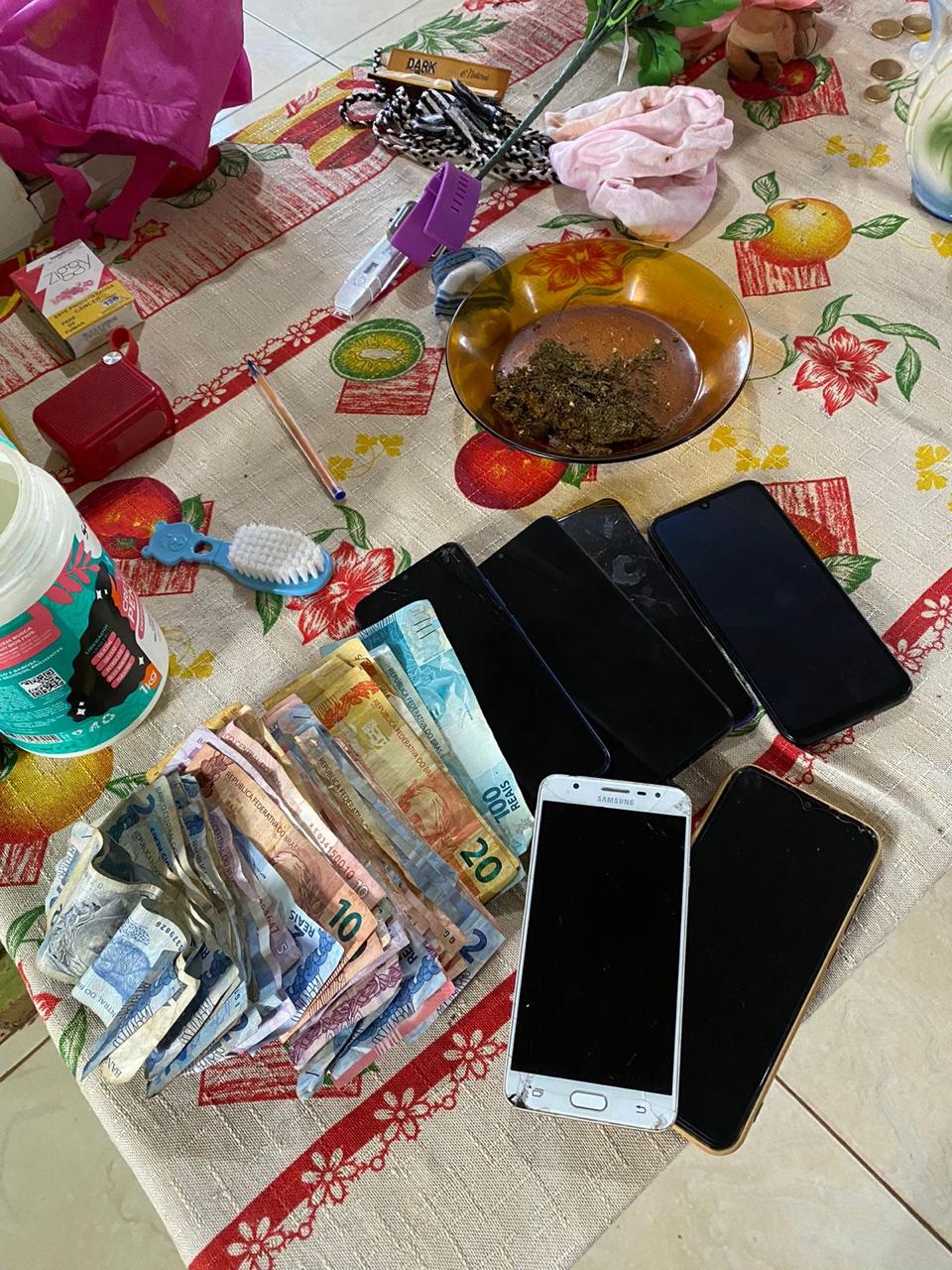 Durante as buscas, foram localizadas: drogas, celulares, dinheiro em notas diversas, além de produtos de furtos no município. Todo o conjunto apreendido é característico de locais utilizados como pontos de venda de drogas.