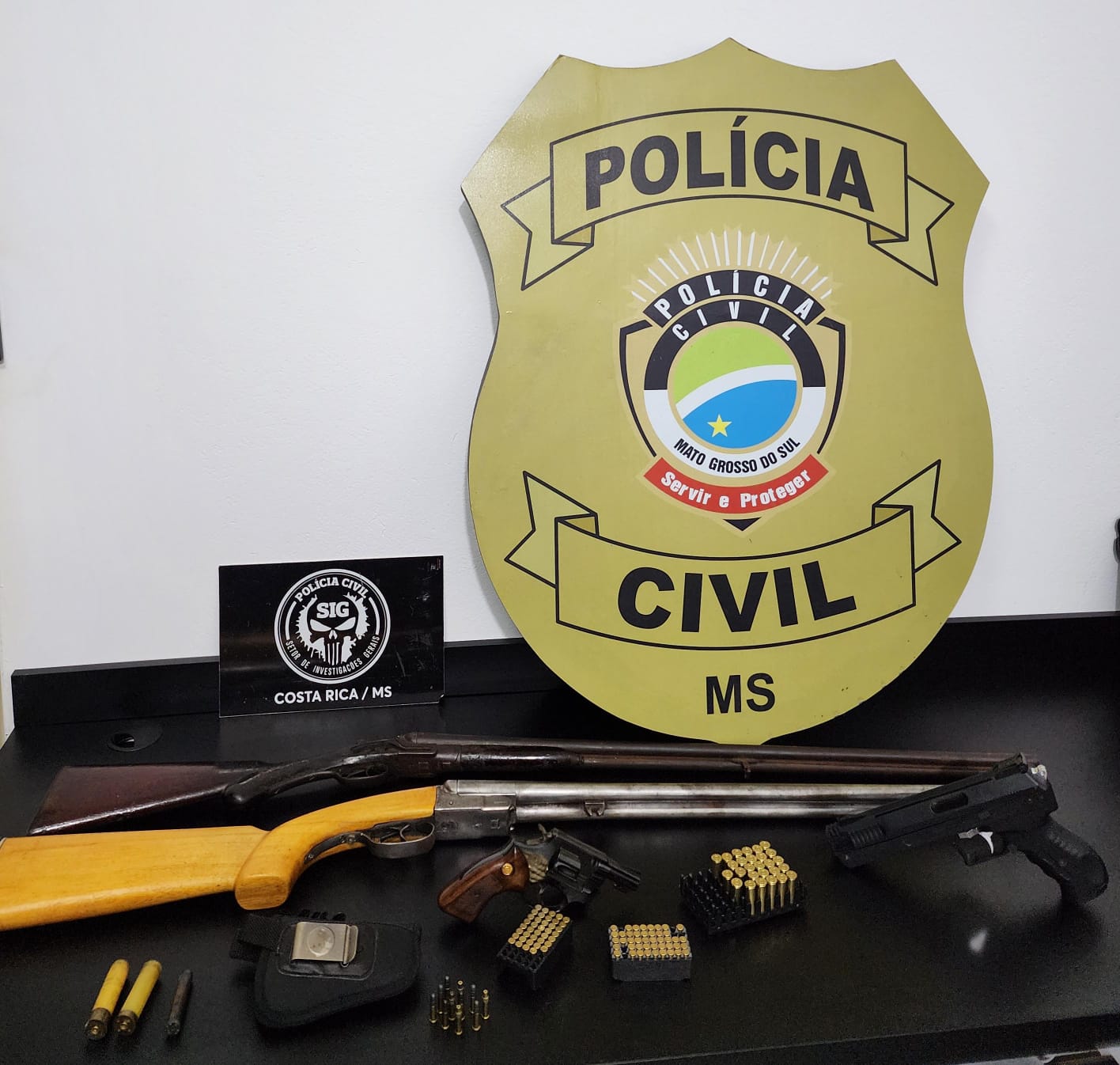 A Polícia Civil, por meio da Delegacia de Costa Rica, realizou na última quarta-feira (26), uma operação policial com o objetivo de cumprir um mandado de busca e apreensão. A ação resultou na localização e apreensão de um revólver, duas espingardas e diversas munições. No momento do cumprimento do mandado, o alvo da operação não estava na residência.
