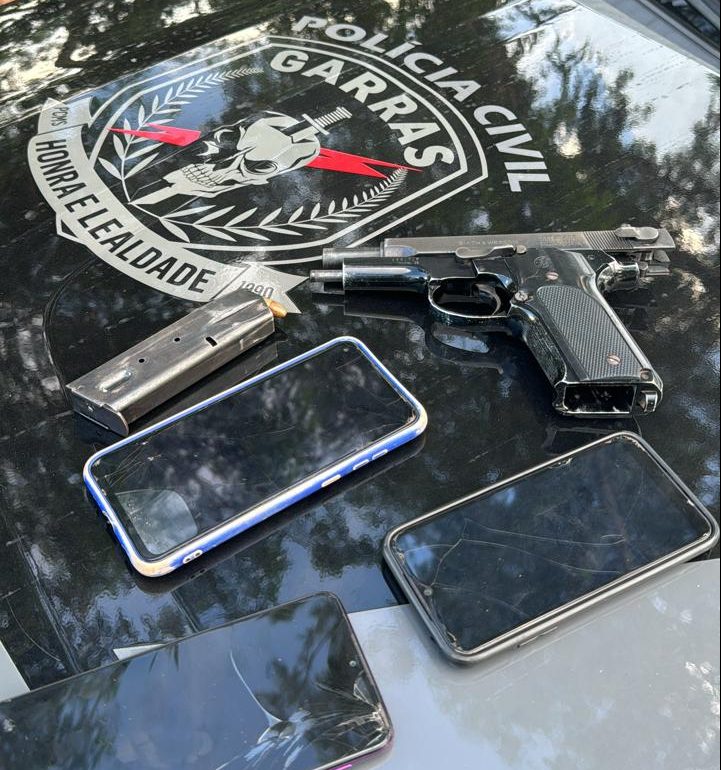 Com D.A.S.R. foi apreendida uma pistola, calibre 9mm. Com o evadido M.L.S. foi localizada uma munição calibre .38 e um documento falso. Ele tentou se passar por outra pessoa, para evitar ser preso, em decorrência do mandado de prisão existente em seu desfavor.