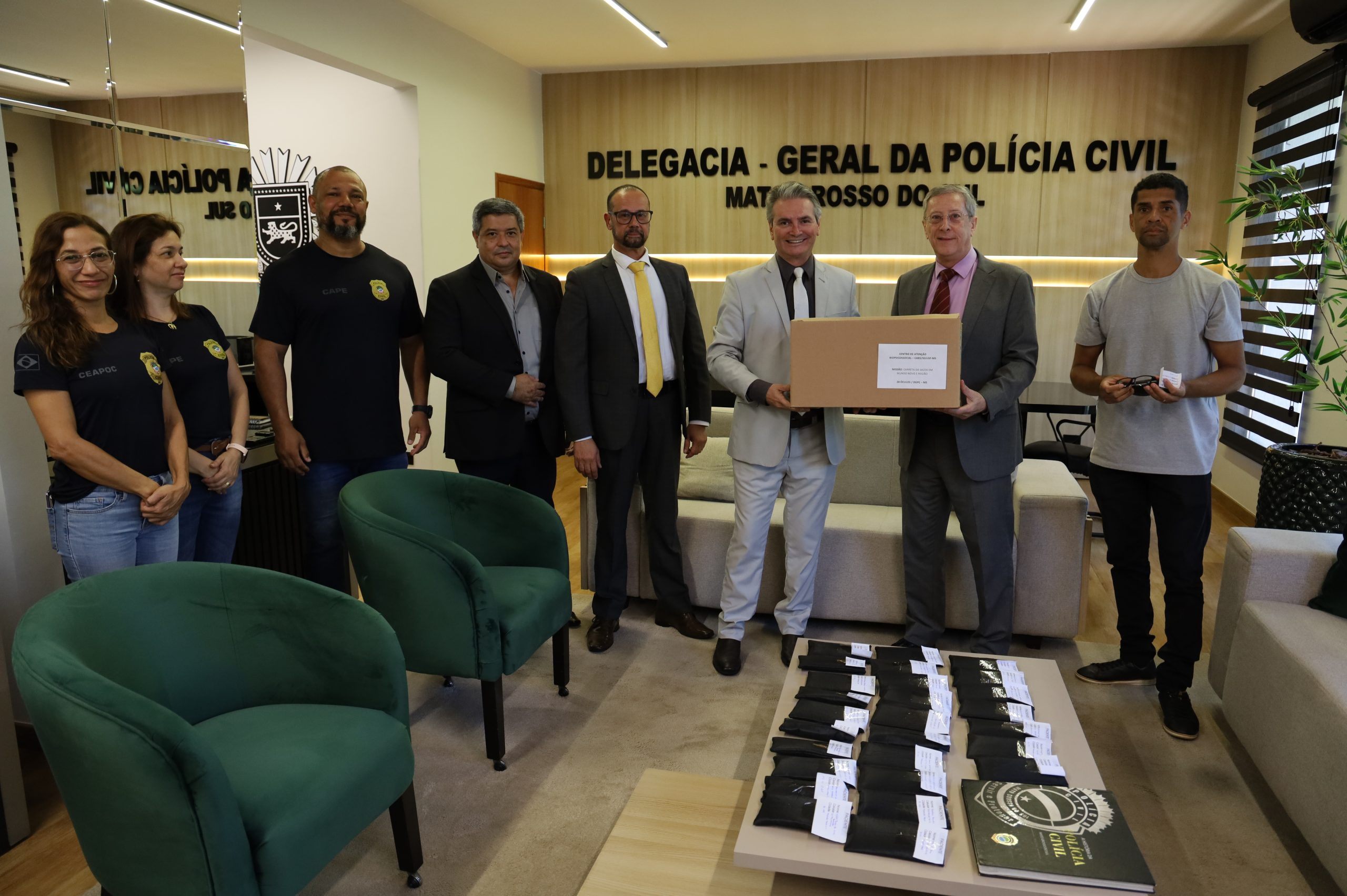 O Delegado-Geral da Polícia Civil do Mato Grosso do Sul, Lupérsio Degerone Lucio, recebeu na manhã desta quinta-feira, 08/05, em seu gabinete, Ivan Gibim Lacerda, o coordenador da Coordenadoria de Atenção Biopsicossocial (CABS) da Secretaria Estadual de Justiça e Segurança Pública (SEJUSP) acompanhado do assessor de espiritualidade do CABS – Adilton Barbosa Mota, para a entrega de 29 óculos, que serão destinados aos policiais civis que foram atendidos pelo projeto Carreta da Saúde, em Mundo Novo-MS.