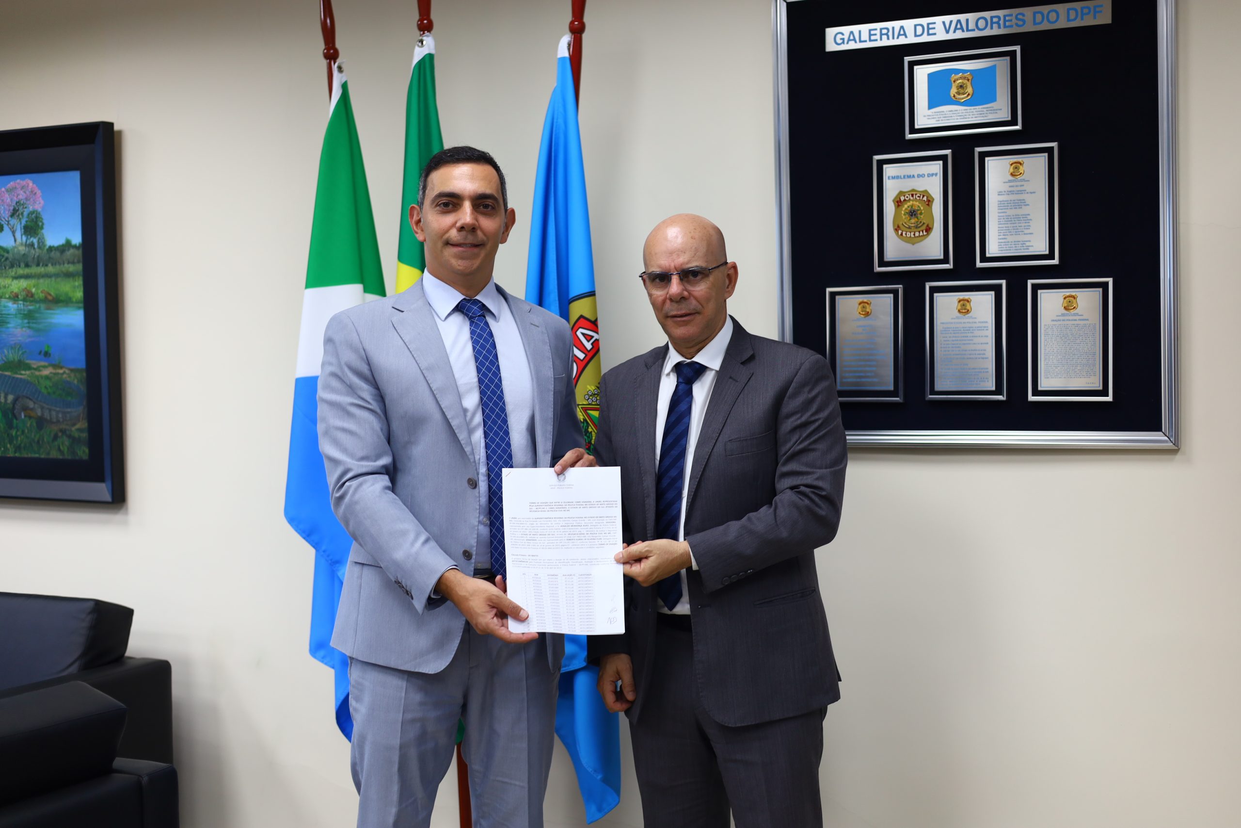 Nesta segunda-feira (23), o Delegado-Geral da Polícia Civil, Roberto Gurgel de Oliveira Filho, visitou as instalações da Polícia Federal em Campo Grande. Lá, ele foi recebido pelo Superintendente Regional da Polícia Federal, Agnaldo Mendonça Alves, para oficializar a assinatura de um convênio de doação.