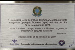 Campo Grande (MS): O Delegado-Geral da Polícia Civil – Adriano Geraldo Garcia – recebeu, no final da tarde desta quinta-feira (21), uma placa de agradecimento pela participação da Polícia Civil na Operação Fronteira Legal, em parceria com a Receita Federal e demais forças de segurança e Exército, para repressão do contrabando e descaminho nas cidades de Mundo Novo, Dourados e Ponta Porã.