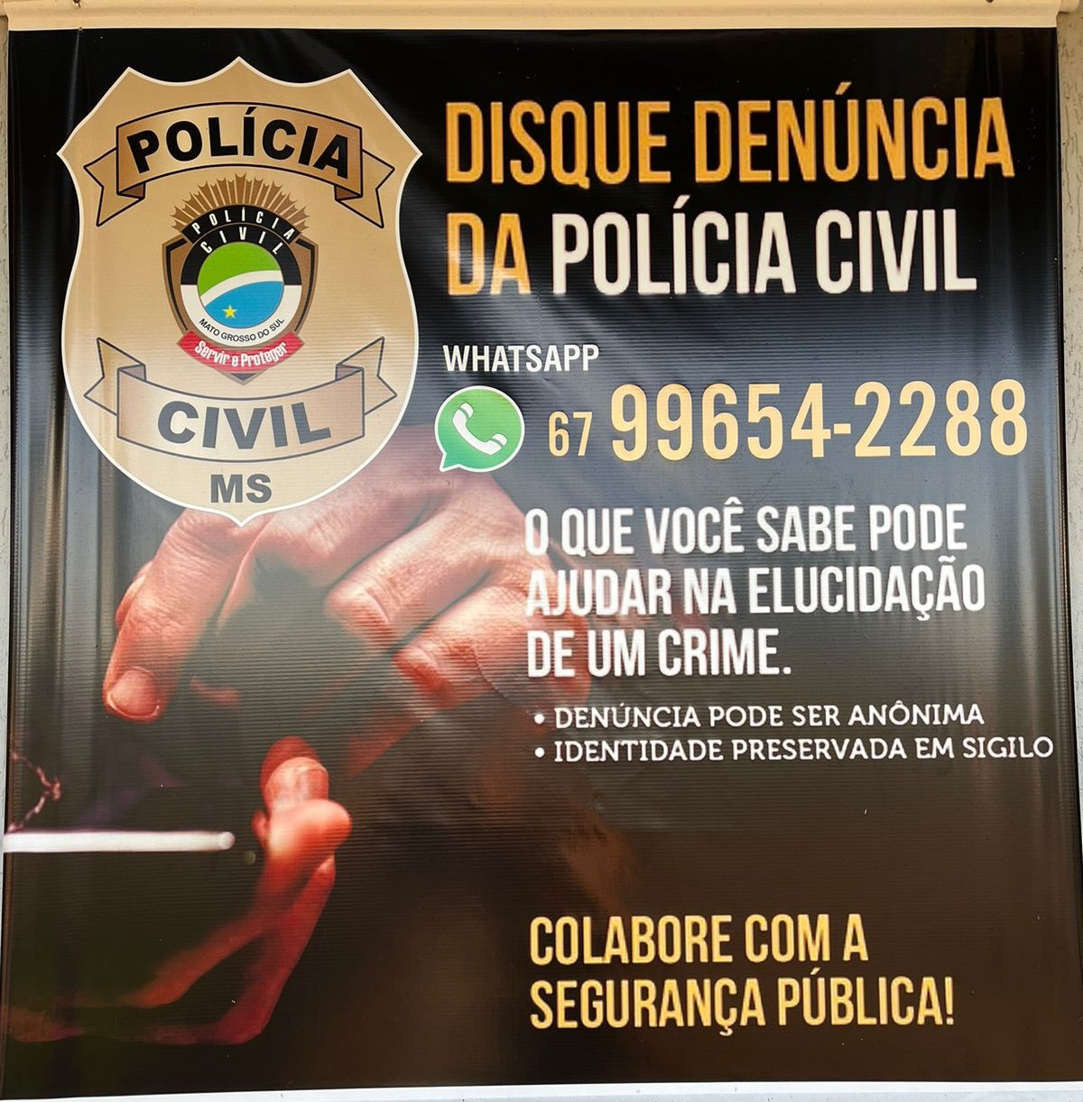 A Polícia Civil reitera a importância da população em denunciar os crimes aos quais tem conhecimento, o que possibilita uma resposta rápida na elucidação dos fatos. O anonimato é garantido, podendo as denúncias serem realizadas pelos telefones: (67) 3465-1121/99654-2288