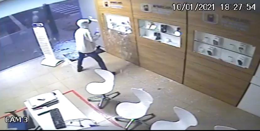 O fato ocorreu na madrugada de domingo (10), ocasião em que dois indivíduos destruíram a porta de vidro do estabelecimento, além de duas vitrines, e invadiram o local. Foram subtraídos um aparelho celular, capas de celular e máquinas de cartão. Enquanto os autores entravam na loja, um terceiro indivíduo ficou na esquina vigiando o local, garantindo a ação dos demais.