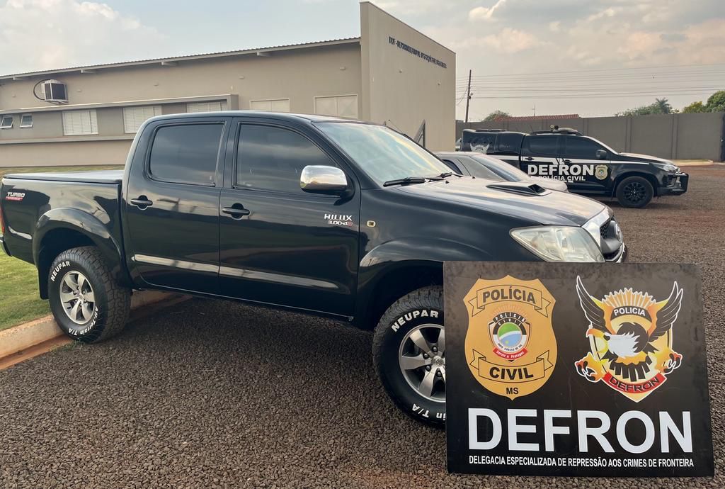 A Polícia Civil, por intermédio da DEFRON (Delegacia de Repressão aos Crimes de Fronteira) recuperou nesta quarta-feira, 03/10, em Dourados-MS, no âmbito da operação Hórus, uma caminhonete Toyota Hilux, produto de estelionato. O crime ocorreu em 26/09, em Campo Grande-MS.