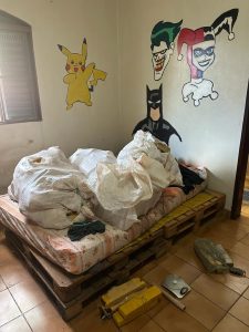 Na sequência, a equipe se dirigiu para uma outra residência, onde havia informações de que o morador da casa poderia estar escondido, onde localizaram J. L. S. A., 23 anos, que mantinha em depósito cerca de 150kg de maconha.