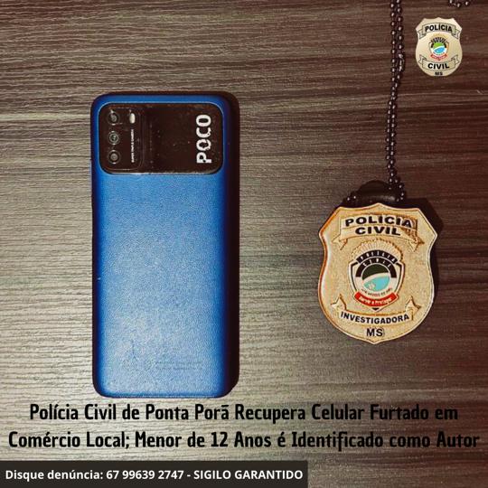 A Polícia Civil, por meio da 1ª Delegacia de Ponta Porã, recuperou nesta sexta-feira, 12/01, um celular que foi furtado em um comércio local. Um adolescente de 12 anos de idade foi identificado como autor. Ele foi conduzido à delegacia para prestar depoimento na presença do Conselho Tutelar.