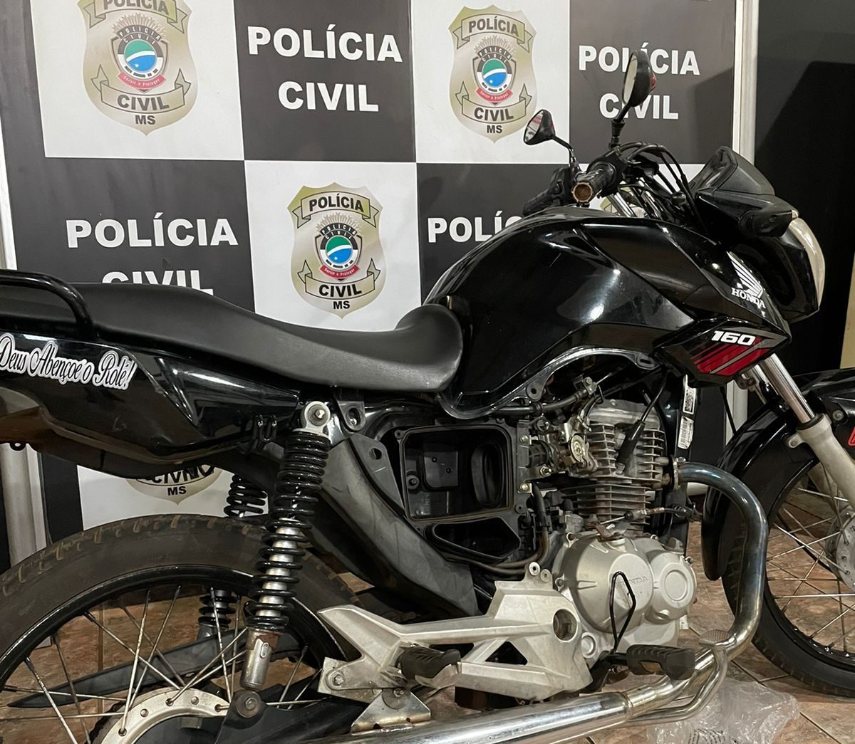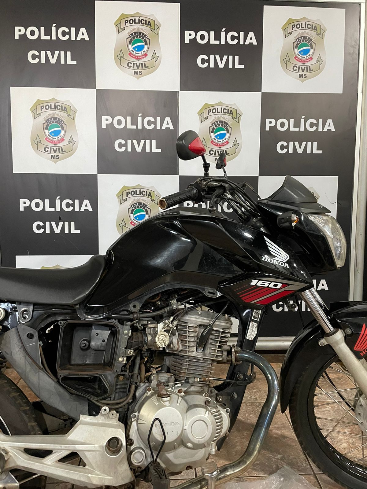 A Polícia Civil, por intermédio da Delegacia de Nova Andradina-MS, recuperou nesta quinta-feira, 01/02, uma motocicleta Honda CG 160, que foi furtada do pátio do Detran do município. Uma pessoa foi presa em flagrante por receptação.