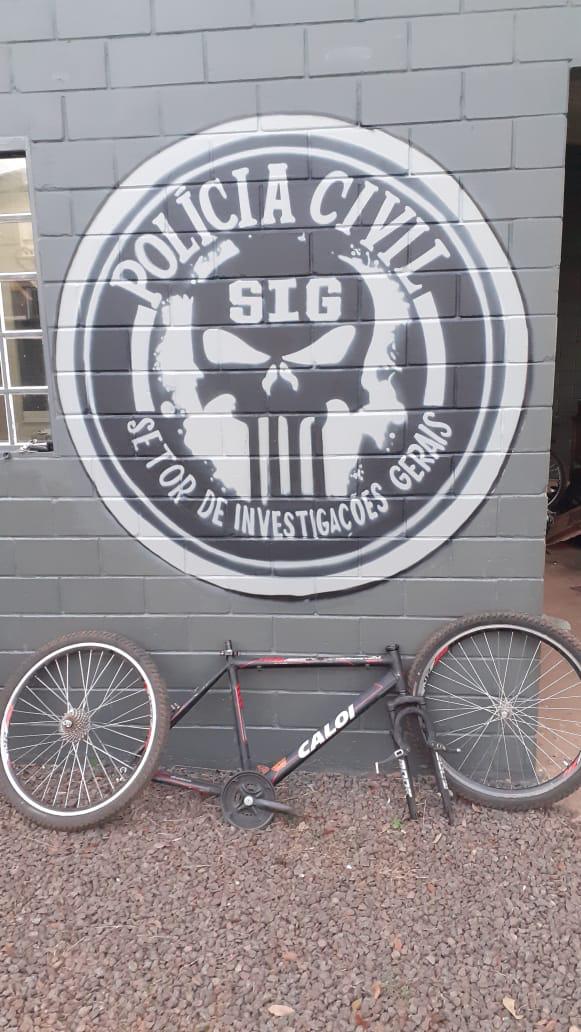 Foram localizados e apreendidos o quadro e as duas rodas da bicicleta. A vítima sofreu o prejuízo aproximado de R$ 1.000,00.